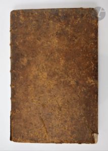 Coiffe de tête arrachée, charnière du premier plat fendue, importants manques aux coins, épidermures. Mouillure sur le bord des premiers feuillets.