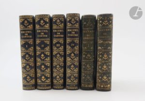 Deux coins légèrement émoussés, les ors sont par endroits effacés aux dos. Traces d'adhésifs sur les gardes. Mouillures claires à la fin du second volume.