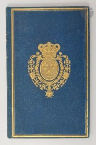 Exemplaire de la bibliothèque du comte de Chambord (1820-1883), Henri V de France, duc de Bordeaux, avec ses armes dorées sur les plats et l’étiquette de Maggs Bros qui avait acquis la bibliothèque de ce dernier.