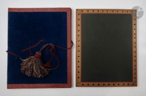 Volume 1, relié en cartonnage souple recouvert de velours bleu foncé, avec liens de fils tressés :