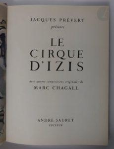 - PRÉVERT (Jacques). Le Cirque d’Izis. Monte-Carlo : André Sauret, [1965]. — In-4, cartonnage toilé de l’éditeur, sous jaquette illustrée.