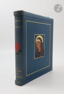 Paris : A. Blaizot et fils, 1934. — In-8, chagrin bleu, composition mosaïquée au centre des plats, représentant la Vierge auréolée sur le premier et une colombe au centre de laquelle figure un cœur rayonnant portant le nom de Jésus sur le second, filet doré en encadrement, filet bleu en bordures des plats, passant par le dos, dos à deux nerfs placés aux extrémités, orné au centre d'une rose mosaïquée, filets dorés et fleur mosaïquée aux angles à l'intérieur, tête dorée, non rogné, couverture et dos conservés (reliure du temps).