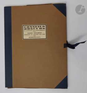 Paris : Léon Pichon, [1925]. — Album in-folio, en feuilles, chemise cartonnée à dos et coins de toile bleue de l'éditeur, rabats intérieurs de papier kraft, lacets.