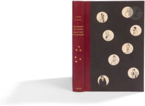 Paris : Henri Goulet, [1925]. — In-8, 262 x 171 : (72 ff.), couverture imprimée. Demi-maroquin bordeaux, plats de papier pelure du Japon noir, 8 reproductions de caricatures tirées du livre collées sur le premier plat, dos lisse orné d'une pastille noire et de 6 pastilles dorées, non rogné, couverture conservée, étui (L. Strid).