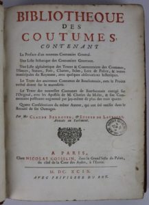 BIBLIOTHÈQUE des Coutumes, contenant La Preface d'un nouveau Coutumier General. Une Liste historique des Coutumiers généraux, Une Liste alphabétique des Textes & Commentaires des Coutumes [...] le texte des anciennes Coutumes de Bourbonnois [...], Paris, chez Nicolas Gosselin, 1699. Deux parties en un volume In-4, veau de l'époque, dos à nerfs orné. Plats et coupes frottées, un mors légèrement fendu, tampon sur la page de titre.
