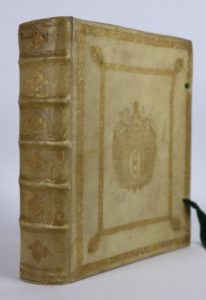 PROPERTIUS. Elegiarum libri IV. Trajecti ad Rhenum (Utrecht), Bart. Wild, 1780. In-4, vélin doré de l'ép., double frise d'encadrement sur les plats, armes dorées de la ville d'Amsterdam, dos à nerfs richement orné, traces de lacets.