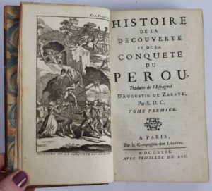 ZARATE. Histoire de la découverte et de la conquête du Pérou. Paris, par la compagnie des libraires, 1742. 2 vol. in-12, veau ép., dos lisse orné.