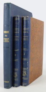 Joint : HOUSSAYE. Monographie du thé. Paris, Chez l'auteur. 1843. In-8, pleine percaline bleue éditeur, avec décor à froid et doré sur le 1er plat. Édition illustrée 18 gravures, dont 17 planches hors-texte. Infimes rousseurs.