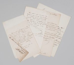 « [] Je renvoie les épreuves à Monsieur Varaigne avec prière de les faire corriger avec soin. Je puis lui donner un nouvel article qui contient des vues générales. Il fera 6 à 7 pages. J'attendrai pour le lui envoyer, qu'il me dise s'il peut le publier ». A Kératry : « Je vous prie de donner un mot au porteur de ce billet pour qu'il puisse prendre chez votre libraire une dizaine d'exemplaires de votre brochure au prix modéré [...] ». A Peuchet : « Je vous aurais adressé avec plaisir plusieurs exemplaires de l'ouvrage sur les moyens de prévenir la disette des grains si huit jours avant votre lettre tous ceux dont le ministère pouvait disposer n'avaient été distribués [...] ». On joint un envoi autographe signé de Mirbel (fragment).