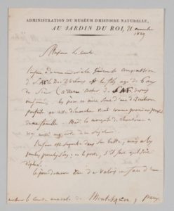 Étienne GEOFFROY SAINT-HILAIRE (1772-1844), naturaliste. L.A.S. au comte Anatole de Montesquiou-Fézensac (1788-1878), général et homme politique, aide de camp du Duc d'Orléans. 2 pp. ½ in-4, en-tête de l'administration du Muséum d'Histoire Naturelle au Jardin du Roi. Paris, 21 novembre 1829. Manque de papier en pied du second feuillet.