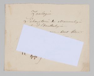 Etienne Geoffroy-Saint-Hilaire accepte une livraison au Muséum. Pièce manuscrite signée Rinalt [?] : « Zoologie. Laboratoire de Mammalogie et d'ornithologie [du Muséum d'Histoire Naturelle]. Bon pour cent litres d'esprit de vin ». Apostille « Approuvé » signée par Étienne Geoffroy-Saint-Hilaire acceptant la livraison.