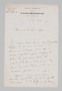 Sur les statuts de la Société Zoologique d'acclimatation, fondée par Isidore Geoffroy Saint-Hilaire en 1854. Il ne peut en aucun cas se rendre au rendez-vous qu'ils avaient convenu, devant se rendre à l'Académie des sciences « dont j'ai l'honneur d'être en ce moment président. Cependant, s'il y avait urgence à nous réunir aujourd'hui, je pourrai quitter l'académie à 3h ½ ou 4 heures []. Du reste, il y a rendez-vous à la Société [d'acclimatation] demain mardi à 4 heures ; je ne pourrai arriver qu'à 5 ; mais j'irai certainement ; et de 4 à 5 on aura avancé le travail ». Il revient sur les statuts [Napoléon III venait d'offrir à la société 19 hectares dans le Bois de Boulogne]. « Je crois que nous devons faire effort 1° sur l'article 1er pour obtenir de meilleures limites, ainsi que nous sommes convenus. 2° sur l'article 2 pour obtenir les 50 ans, s'il est possible []. Mais sur le reste, je trouve que nous avons énormément gagné, en tenant compte, à l'égard de certains articles, des explications qui nous ont été données []. Au surplus, je ne puis que ? pour la part à la Commission et en particulier à son honorable rapporteur et à M. Gervais [le zoologiste Paul Gervais], dont le dévouement à la Société est digne de la profonde gratitude de la Société [] ».