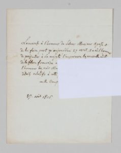 Présentation de la Flore Française à NAPOLÉON. « Lamarck a l'honneur de saluer Monsieur Agasse et de lui faire part qu'aujourd'hui 27 avril, il a eu l'honneur de présenter à Sa Majesté l'Empereur la nouvelle édition de la Flore Française à St Cloud après la messe. Lorsqu'il aura l'honneur de voir M. Agasse, il lui donnera des détails relatifs à cette présentation. Mille compliments et amitiés. »
