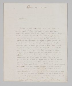 Très rare et longue lettre écrite au moment de sa mission d'inspection des dépôts de brebis mérinos dans les départements, que le gouvernement lui avait confié quelques mois plus tôt (mars 1811). « Me voilà en route pour aller remplir la mission dont je suis chargé []. Je voyage à petites journées et à cheval, c'est le moyen le plus économique et le plus convenable pour les visites que j'aurai à faire. Cette manière hussarde de voyager n'a rien de désagréable, on voit très bien les pays où l'on passe. J'ai choisi un animal de naturel pacifique qui ne trouble pas par une trop grande vivacité mes réflexions. Nous sommes déjà bien accoutumés ensemble, je le nourris bien et il me porte de même ». Il raconte des anecdotes arrivées durant son voyage, en particulier dans une petite auberge devant partager la chambre avec une femme qui accouchait. « C'est une triste chose, Madame, que de quitter Paris surtout quand on pense que l'éloignement sera de quelque durée []. J'espère, Madame, que cette influence ne s'étendra pas jusqu'à la rue du Bacq et que ses habitants auront quelque fois dans des moments de loisir la bonté de penser à ma moutonnerie. Cette diable d'inspection est bien loin []. Vous me demandez ce que vaut ma place ? Peu de choses, 2400 # d'appointement puis des frais de route qui ne sont pas réglés pour cette année []. Vous voyez que je ne tonds encore, ni n'écorche ces pauvres mérinos, mais avec le temps il me sera peut-être permis de viser à une inspection générale et alors la place vaudra la peine. Il était essentiel pour l'avenir, que je tins à quelque chose, le gouvernement n'abandonne point ceux qu'il emploie [] ». [Ce n'est que 5 ans plus tard, en 1816, qu'il sera nommé directeur du Jardin Royal de Pondichéry et correspondant du Muséum].