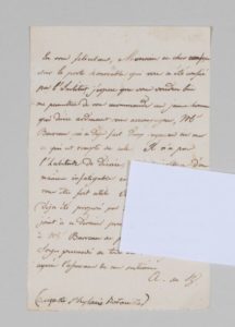 Auguste de Saint-Hilaire félicite son confrère pour le « poste honorable » que l'Institut lui a confié, et lui recommande un jeune homme « qui désire ardemment vous accompagner, M. Barreau, qui a déjà fait deux voyages sur mer et qui est rempli de zèle. Il n'a pas l'habitude de décrire, mais il récoltera d'une manière infatigable et pourra par conséquent vous être fort utile [...] ».