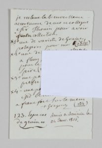 Remise de graines du Muséum. « Je réclame la bienveillance accoutumée de mon collègue Mr Thouin pour avoir quatre collections. 1° une de variétés de graines potagères pour moi [note de Thouin « 68 esp. »]. 2° une de graines potagères à fleurs, à fourrage et pour le sous-préfet de Spire. 3° une pareille pour le préfet du Mont-Tonnerre. 4° une pareille pour Mr Bettman banquier à Francfort sur le Main ». Puis en dessous : « 123 espèces de graines ». Thouin a noté : « Remis à domicile le 24 janv. 1806 ».