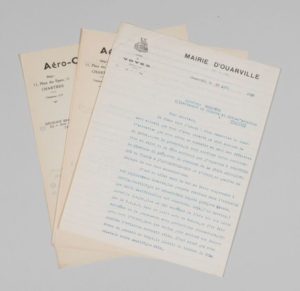 3 lettres du maire d'Ouarville à Maurice Bellonte (+ 1 double de réponse), dont 2 à l'en-tête de l'Aéro-club d'Eure-et-Loir. La première, au sujet de la fête aérienne d'Ouarville et de la propagande qu'il organise dans les communes du département. Les autres au sujet du projet de stèle à Maisons « à la mémoire du regretté Capitaine Ludovic Arrachat, à l'endroit même où il tomba le 23 mai 1933, au cours des épreuves de la coupe Deutsch-de-la-Meurthe ».