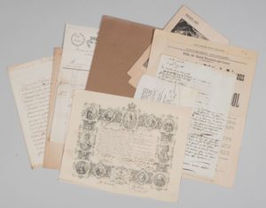 - Ordination d'un prêtre par l'évêque de Nantes (Gabriel de Beauvau, 1650, parchemin) ; manuscrit d'une chanson sur la Vendée par Le Bouvier des Mortiers ancien maitre des comptes à Nantes (début XIXe) ; affichette interdisant la vente d'alcool à Saint-Nazaire (juillet 1918) ; programme d'un concert-conférence au casino de La Baule (1920) ; extrait de l'audience tenue au bourg d'Avessac (les paysans ayant laissé paître leurs vaches sur les terres de la seigneurie, 10 pp. in-4, 1740) ; facture illustrée d'un fabriquant de parapluies nantais (1848) ; affiche « Instruction sur le service des convois militaires » (Nantes janv. 1820) ; lettre de Guiberteau à Nantes (1738).