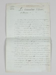 Lettre amicale du commandant de Strasbourg, écrite durant les cent-jours, donnant des informations sur l'esprit de la population. « Je suis passablement établi ici ; grâce à 30 bouteilles de bon Bordeaux que j'ai apporté de Paris, et du vin du Rhin que je me suis procuré, et quelques amis, les journées se passent avec assez de rapidité. Depuis dix lieues de Paris jusques ici j'ai trouvé l'esprit excellent, les paysans crient partout vive l'Empereur, tout est sous les armes et parfaitement disposé à repousser l'agression de ces hordes d'esclaves et de brigands et même si l'ennemi s'avance sur nos terres, il est des contrées où les femmes doivent employer tous leurs moyens pour aider les armées à les erreinter, pour cela elles ont de grands et puissants moyens []. Il arrive sans cesse des gardes nationales, elles font une guerre cruelle aux éteignoirs et girouettes ; vous devriez bien nous envoyer les malins du faux-bourg St Germain on les mettrait bien vite à la raison. C'est au point que dans un village peu distant d'ici, un voltigeur ayant voulu discourir sur les événements du mois de mars, a été assailli par les gardes nationaux et eut été tué sans des personnes qui l'on arraché de leurs mains. A Bedfort [Belfort ?] les officiers des gardes nationales ont à leurs frais fait faire plusieurs enseignes ayant pour titre l'Empereur, Marie-Louise ou le Roi de Rome, ensuite ont arraché celles de certains négociants qui ne leur convenait pas et par force ou de gré, ont mis les leur en place : vous seriez enchanté si vous étiez dans ce pays, les Alsaciens font des sacrifices immenses [] ».