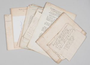- [Métiers]. 3 documents : Lettre circulaire de J.M. Privat, daté de 1821, qui s'étant installé à la Croix-Rousse, vient de fonder une maison spécialisée dans la fabrication « d'étoffes de cotons façonnés en tous genres » et de « tissus de fantaisie et de goût dans les dispositions et les couleurs les plus fraîches ». Facture illustrée de l'orfèvre joaillier Grognier Arnaud à Lyon (1836). Longue feuille de comptes d'Antoine Daviot maréchal-ferrant à Beaujeu (1787).