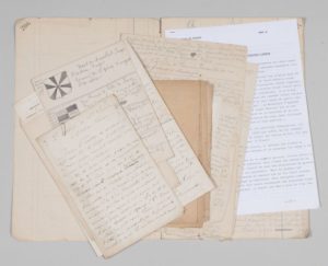 « L'abbaye de Saint-Séverin à Château-Landon » (manuscrit autographe signé Alfred Aubert, 8 pp. in-8, avec nombreuses corrections, février 1876). Note sur un sceau inédit de l'Abbaye de Saint-Séverin de Château-Landon (ms, 3 pp. in-8). Feuillet d'armoiries (blasons avec notes héraldiques). Notes prises sur des documents anciens. Quelques lettres d'érudits et d'archivistes. Un grand cahier de notes contenant des relevés faits dans le prieuré Saint-André (10 pp. in-folio, avec croquis).
