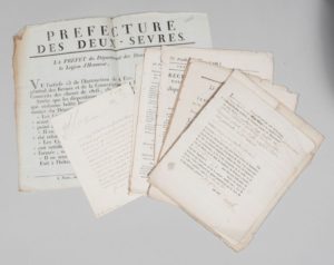Petite affiche de la préfecture des Deux-Sèvres relative la conscription (Niort, 19 oct. 1808), imprimé de 12 pp. « années 1791 / Dernier trimestre / Département des Deux Sèvres / Liste des deux cens Citoyens désignés pour servir dans le juré de jugement pendant les mois d'Octobre, novembre et décembre » document accompagné de l'assignation de l'un des jurés, 5 imprimés révolutionnaires imprimés à Niort (recueil des actes de la préfecture, recueil d'instruction pour les maires). Lettre de l'ancien préfet des Deux-Sèvres (écrite en son nom) qui après sa destitution puis sa réintégration propose à M. de Laubier (à Melle) de le seconder dans ses nouvelles fonctions.