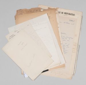 - 28 lettres de personnalités vosgiennes : Maurice Barrès (4 lettres). Baron de Ravinel (député des Vosges, 9 lettres). Jules Méline (9 lettres). Etienne Pariset. Louis Madelin. Eugène de Mirecourt (3 lettres). François de Neufchâteau (longue lettre à Chabrol de Volvic, taches et usures).