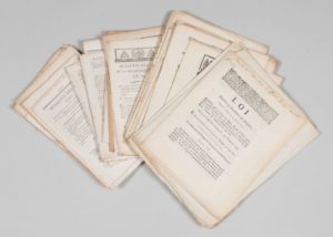 - 32 lois et décrets révolutionnaires, in-4, 1791-1793 : « Loi relative au commerce du Sénégal » (2 exemplaires), lois sur le commerce des échelles du Levant et de Barbarie, le régiment d'artillerie des colonies, les troupes coloniales, les possessions françaises des deux Indes, les émigrés aux Colonies, les fonctionnaires publics des colonies, « loi portant que les colons peuvent tirer de France tous les ouvrages neufs d'orfèvrerie et de joaillerie », etc.