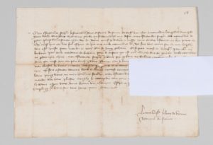 Rarissime et précieuse lettre entièrement autographe, donnant des nouvelles de la Cour. « Plaise vous savoir que le Roy la Royne mons. de Valloys et mess leurs oncles étoient en bon point []. Le Roy fait une armée sur la mer laquelle doit estre preste pour monter le xxiie jour de juing prochain. Et se part mons. de Goingne pour aller en Brebant par devers madame de Brebant pour le descort qui est entre elle et le duc de Guerle ». Il lui demande de lui adresser l'argent qui lui est dû « au plus bref que vous pouvez car je lavoye ordonné estre baillé aux ouvriers qui font mon chastel de bonne encontre [] ».