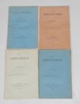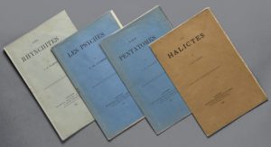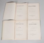 FABRE J. H. LES RHYNCHITES - LES PSYCHÉS - LES PENTATOMES - LES HALICTES. LOUVAIN, POLLEUNIS & CEUTERICK 1899 - 1900 - 1901 - 1902. Quatre fascicules, in-8, brochés de 32 pp., 39 pp., 23 pp., 27 pp., couvertures de diverses couleurs imprimées. Parfait état, certains non lu. Extraits de la Revue des Questions Scientifiques.