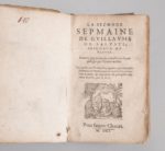 SALUSTE Guillaume de, Seigneur du Bartas LA SECONDE SEPMAINE DE GUILLAUME DE SALUSTE, SEIGNEUR DU BARTAS ; revue, augmentée & embellie en divers passages, par l'auteur même. En laquelle ont esté adioustez argument général, amples sommaires au commencement de chacun livre, annotations en marge, & explication des principales difficultez du texte, par S. G. S. [GENÈVE], POUR JAQUES CHOUËT, 1601. Quatre parties réunies en un volume, in-16, de (12) ff., 583 pp., (17) pp., (12) ff., 213 pp., (1) f. bl., 168 pp., 168 pp., pleine reliure de l'époque en vélin souple, trace de lacets. Titre manuscrit sur le dos (en partie effacé), coiffe supérieure accidentée, cerne de mouillure dans la dernière partie, piqûres ou rousseurs éparses, tête un peu courte. La poésie de Bartas eut un immense succès en son temps, peut-être parce qu'on y trouvait également une foule d'enseignement sur les anciens, la science, et les inventions. L'édition comprend les abondants et érudits commentaires de Simon Goulart.