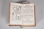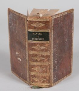 BAILLY C. MANUEL THÉORIQUE ET PRATIQUE DU JARDINIER. PARIS, RORET, 1824. Deux parties réunies en un fort volume, in-12, de (2) ff., XLIV pp., 310 pp. - (2) ff., X pp., 468 pp., pleine reliure de l'époque en basane granitée. Dos lisse très orné et doré portant une pièce de titre en maroquin bronze, guirlande dorée autour des plats, filet doré sur les coupes, tranches jaspées. Petites attaques sur le second plat, la coiffe inférieure et le mors du second plat, rousseurs claires éparses. Trois planches dont 2 repliées dans la première partie, trois planches dans la seconde partie.
