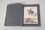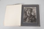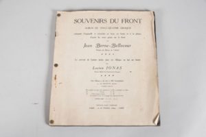BERNE - BELLECOUR Jean. SOUVENIRS DU FRONT. PARIS, ÉDITIONS D'ART GUERRIER A. LE PRINCE, 1918. Un volume, in-folio, en feuilles simplement réunies par trois fixations métalliques. Une feuille de titre et 25 feuilles portant autant de planches contrecollées chacune dans un encadrement de filets noirs. Album de 24 croquis rehaussés d'aquarelle et retouchés au lavis, au fusain et à la plume, d'après les notes prises sur le front par Jean Berne - Bellecour peintre du Musée de l'Armée. Le portrait de l'artiste inclus dans cet album est fait au fusain par Lucien Jonas peintre officiel du Gouvernement Français.