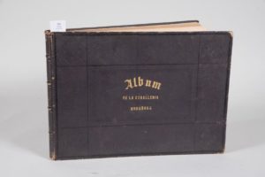 CLONARD General Conde de. ALBUM DE LA CABALLERIA ESPANOLA. DESDE SUS PRIMITIVOS TIEMPOS HASTA EL DIA. MADRID, IMPRENTA Y LITOGRAPHIA MILITAR DEL ATLAS, S. BERNARDINO, 7, 1861. Un volume, grand in-4 oblong, de 40 pp., 70 planches lithographiées, pleine reliure en chagrin noir. Dos à 4 nerfs orné de roulettes dorée, premier plat compartimenté à froid pour encadrer le titre doré, mêmes compartiments à froid sur le second plat pour encadrer des armes dorées. Quelques frottements sur la reliure. Très belles planches lithographiés en couleurs, animées de deux cavaliers par planche, couleurs très fraîches.