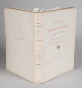 COURTEAULT Henri. LE BOURG - SAINT - ANDÉOL. Essai sur la constitution et l'état social d'une ville du midi de la France au Moyen Âge. Introduction a l'histoire de la maison de Nicolay. Rédigée et publiée sous les auspices de M. le marquis de Nicolay et d'après les documents recueillis par M. A. de Boislisle. PARIS, HONORÉ CHAMPION, 1909. Un volume, in-4, broché de XXIV pp., 285 pp., (1) f., couverture rempliée portant le titre imprimé en deux couleurs au dos et sur le premier plat. Non rogné. Bon exemplaire. Illustré par 6 grands planches.