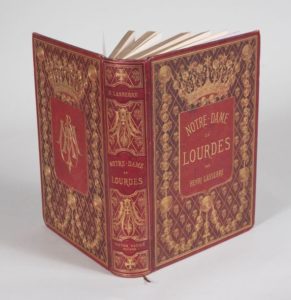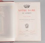 LASSERRE Henri. NOTRE DAME DE LOURDES. PARIS, VICTOR PALMÉ - BRUXELLES LEBROCQUY, 1877. Un volume, grand in-8, de VIII pp., 560 pp., pleine reliure rouge de l'époque. Dos lisse orné et doré portant le titre doré. Titre répété sur le premier plat dans un important décor rouge et or, tranches dorées. Quelques rousseurs essentiellement sur les premiers et derniers feuillets. Édition illustrée d'encadrements variés à chaque page et de chromolithographies. Scènes, portraits, vues à vol d'oiseau, cartes et paysages.
