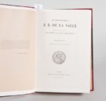 RAVELET Armand. LE BIENHEUREUX J. B. DE LA SALLE. Fondateur de l'institut des Frères des Écoles Chrétiennes. Introduction par M. D'Hulst. TOURS, MAME ET FILS, 1888. Un volume, in-4, de XXXII pp., 686 pp., (1) f., demi-reliure à coins de l'époque en chagrin rouge. Dos à 5 nerfs très orné et doré portant le titre doré, filet doré sur les plats, tête dorée. Rares rousseurs claires éparses. Bel exemplaire avec de très nombreuses illustrations.