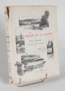 ROLLAND E. de & D. CLOUZET. LES BORDS DE LA SAÔNE DE LYON A TRÉVOUX. 227 illustrations inédites. LYON, CUMIN & MASSON, 1908. Un volume, in-4, broché de 198 pp., (1) f., couverture rempliée titrée en rouge et illustrée de vues du parcours. Petites déchirures en tête et pied sur les mors de la couverture, quelques piqûres sur les tranches, rares et éparses à l'intérieur. Tirage numéroté limité à 600 exemplaires. L'un des 570 sur beau papier vélin blanc.