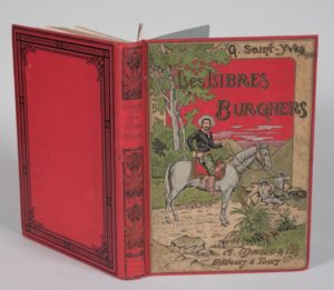 SAINT - YVES G. LES LIBRES BURGHERS. Illustrations d'Alfred Paris. TOURS, MAME & fils, 1901. Un volume, grand in-8, de 287 pp., reliure éditeur habillée de percaline rouge. Titre en noir au dos et doré dans un important décor personnalisé en couleurs sur le premier plat, tranches dorées. Bon exemplaire. Nombreuses illustrations.