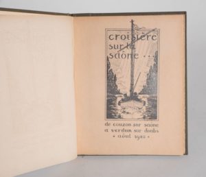 TAPUSCRIT - CROISIÈRE. CROISIÈRE SUR LA SAÔNE. De Couzon sur Saône a Verdun sur Doubs. TAPUSCRIT, Août 1925. Un volume, in-8, de 43 pp., cartonnage à la bradel décoré en creux d'une gravure personnalisée et du titre. Après les découverte du Rhône la croisière sur la Saône s'imposait. Beaucoup de précieuses indications sur le parcours, illustré par des paysages au fusain reproduits, quelques photographies, une carte établie avec minutie.