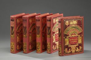 VERNE Jules. VINGT MILLE LIEUX SOUS LES MERS - UN CAPITAINE DE QUINZE ANS - LA MAISON A VAPEUR - MICHEL STROGOFF - CINQ SEMAINES EN BALLON. PARIS, LIBRAIRIE HACHETTE, s. d. Cinq volumes, in-8, habillés de percaline rouge, décors en noir et or reprenant ceux de la collection Hetzel. Premier plat à un éléphant, titre dans le cartouche, "Voyages extraordinaires" dans l'éventail, dos au phare, tranches jaunes, têtes dorée. Cinq volumes de la Collection Hetzel des Voyages extraordinaires, avec les illustrations.