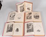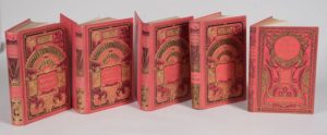 VERNE Jules. L'ÎLE MYSTÉRIEUSE - MATHIAS SANDORF - LE TOUR DU MONDE EN 80 JOURS - LES ENFANTS DU CAPITAINE GRANT - LE SECRET DE WILHELM STORITZ. PARIS, LIBRAIRIE HACHETTE, Cinq volumes, in-8, habillés de percaline rouge, décors en noir et or reprenant deux de la collection Hetzel. Premier plat à un éléphant, titre dans le cartouche, "Voyages extraordinaire" dans l'éventail, dos au phare, tranches jaunes, tête dorée. Le dernier volume, Le Secret de Wilhelm Storitz, est un volume simple dans le décor des volumes simples de Hetzel et portant Hachette sur le premier plat.