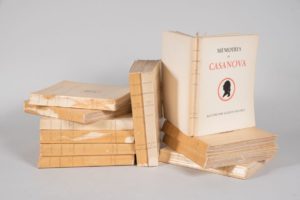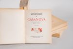 CASANOVA - Jacques TOUCHET. MÉMOIRES. PARIS, AUX ÉDITIONS DU RAMEAU D'OR, s. d. (vers 1950). Douze volumes, petit in-4, brochés, couvertures imprimées et illustrées en couleurs. Bon exemplaire. Illustrées d'aquarelles originales par Jacques Touchet.