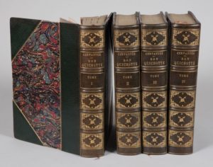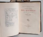 CERVANTÉS SAAVEDRA Miguel de - Daniel VIERGE. L'INGÉNIEUX HIDALGO DON QUICHOTTE DE LA MANCHE. PARIS, HACHETTE & Cie, 1909. Quatre volumes, in-4, demi-reliures à coins en maroquin vert. Dos à 5 nerfs très ornés et dorés portant les titres dorés, filets dorés sur les plats, têtes dorées, couvertures conservées. Illustrations de Daniel Vierge.