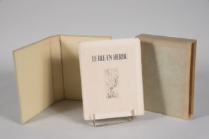 COLETTE - Marianne CLOUZOT. LE BLÉ EN HERBE. PARIS, FLAMMARION, 1947. Un volume, petit in-4, en feuilles sous une chemise rempliée illustrée et imprimée, dans un double emboîtage de l'imprimeur. Bon exemplaire. Illustré de gravures originales de Marianne Clouzot