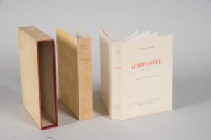 LOUS Pierre - André COLLOT. APHRODITE. Moeurs antiques. MONTE - CARLO, AUX ÉDITIONS DU LIVRE, 1948. Un volume, in-8, broché, couverture rempliée imprimée en deux couleurs dans un double emboîtage de l'éditeur. Bon exemplaire aux feuillets non coupés. Illustrations en couleurs d'André Collot.