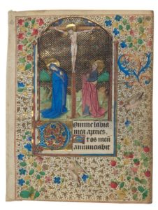 Crucifixion, miniature cintrée entourée de bordures enluminées avec décor d'acanthes colorées, feuilles de vigne et besants dorés, motifs floraux et oiseaux sur fond réservé.