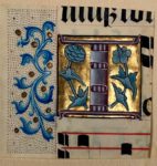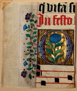 Initiale ornée «I», dim. de l'initiale : 70 x 67 mm ; dimensions du fragment : 141 x 121 mm. Initiale mauve avec rehauts blancs sur fond à l'or bruni, avec deux grandes fleurs vert turquoise, bordure sur fonds criblé avec décor de feuilles d'acanthe bleues soulignées de blanc et petits disques à l'or bruni.