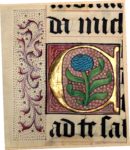 Initiale ornée «C», dim. de l'initiale : 71 x 70 mm ; dimensions du fragment : 138 x 138 mm. Initiale à l'or bruni sur fond rose avec décor blanc, grande fleur dans le corps de la lettre, bordure sur fond criblé avec décor de feuilles d'acanthe violettes et mauve pâle soulignées de blanc et petits disques à l'or bruni.