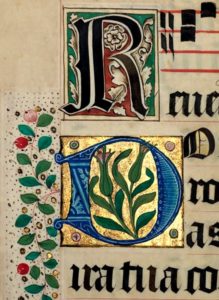 Initiale cadelée «R» avec rehauts d'aquarelle et initiale ornée «D», dim. de l'initiale «R» : 55 x 68 mm , dim. de l'initiale «D» : 70 x 65 mm ; dimensions du fragment : 157 x 205 mm. Initiale peinte en bleu avec rehauts blancs sur fond à l'or bruni, fleurs dans le corps de l'initiale, bordure sur fond criblé avec décor de fleurs et petits disques à l'or bruni.